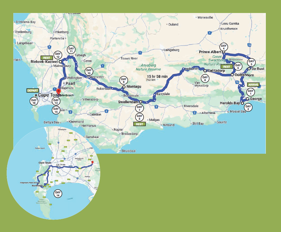 16 Tage, 900 Kilometer und über 6’000 Höhenmeter – Remo und seine Freunde radeln für Velafrica auf der Route 62. Diese Strasse führt von der Industriestadt George im Süden des Landes nach Kapstadt an der Westküste Südafrikas. Dabei radelt Remo durch malerische Landschaften: Hohe Klippen, kristallklare Flüsse und die lokale Pflanzenwelt prägen diesen «Ride for Impact». Die Route führt durch die kleine und grosse Karoo, über den Outeniqua und den Meiringspoort Pass und entlang der Küste über den Chapman’s Peak Loop.