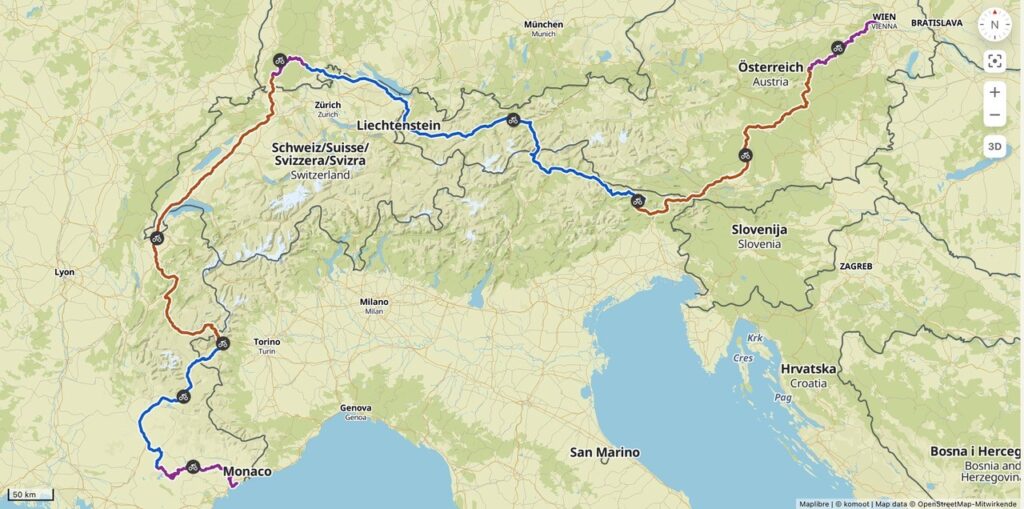 Für seinen Ride for Impact fährt Thomas gemeinsam mit seinem Schwager Stef vom 5. bis 15. Juli 2025 das Three Peaks Bike Race. Dabei handelt es sich um ein Ultra Bikepacking-Rennen von Wien nach Nizza. Die Route haben Thomas und Stef selbst geplant. Die einzige Vorgabe: Sie muss über drei Gipfel – den Monte Zoncolan, den Feldberg und den Colle delle Finestre – führen. So fährt Thomas innerhalb von 10 Tagen rund 2’200 km und über 26’000 Höhenmeter.